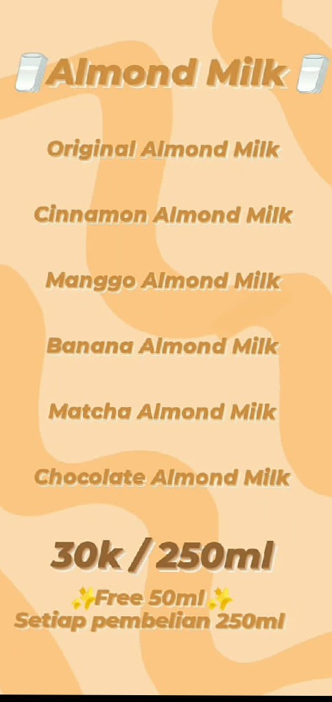 minuman sehat yang mengandung susu almond, berbahan dasar kcang almond yang baik ubtuk kesehatan tulang dan tubuh, bahkan bisa digunakan sebagai susu nabati pengganti susu hewani (bagi yang alergi)