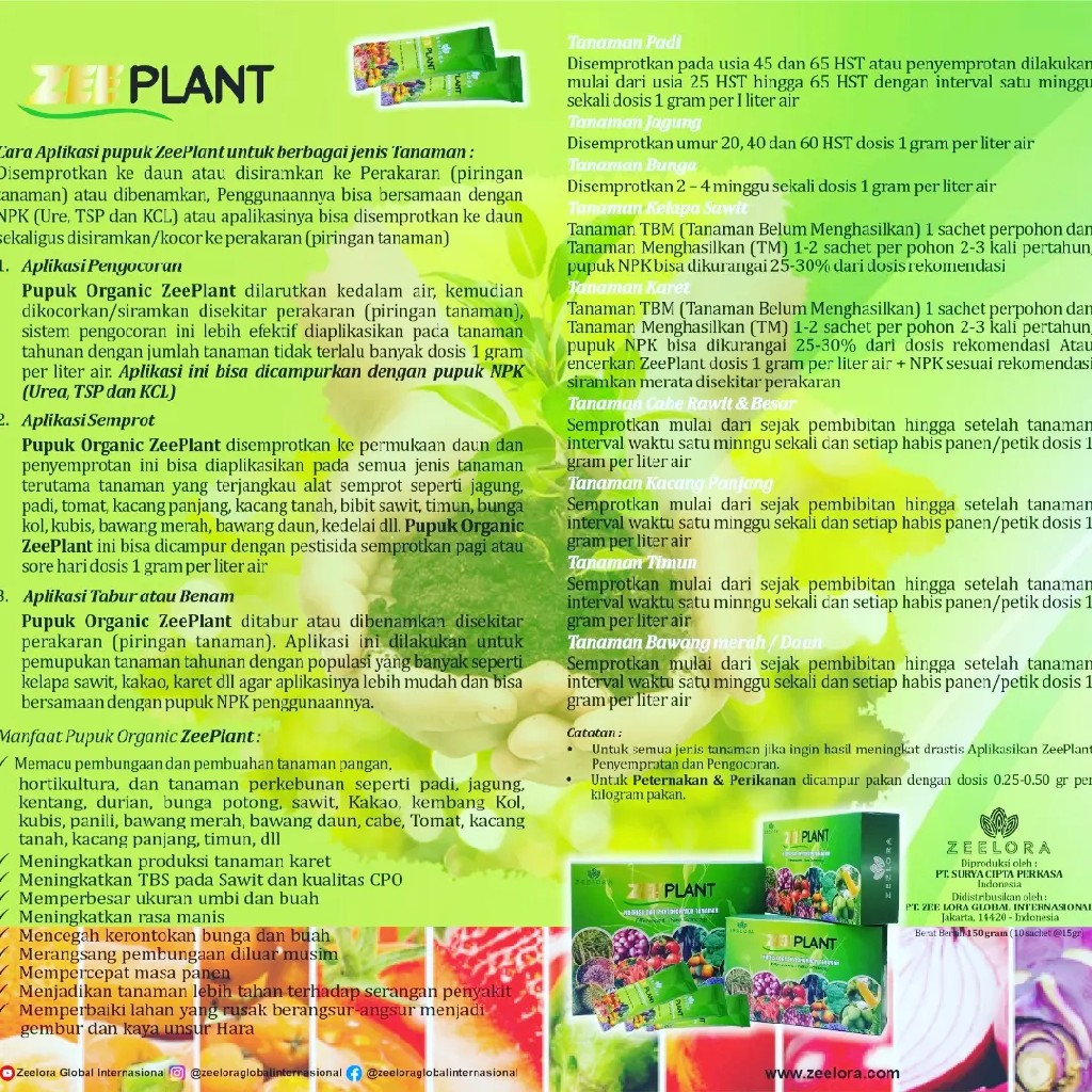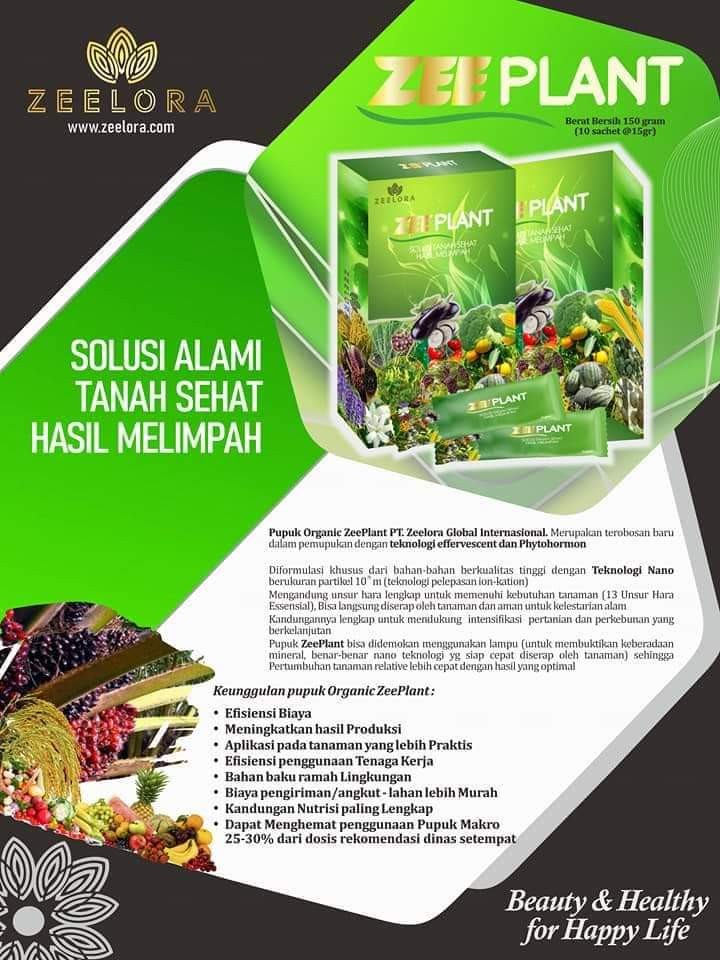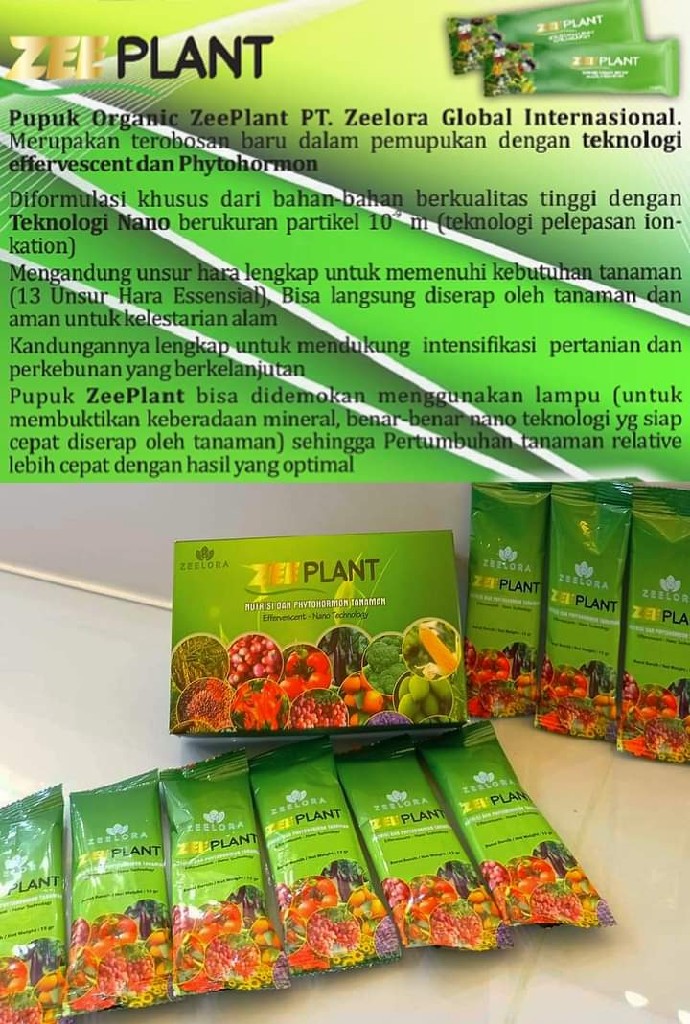 _ZEE PLANT pupuk Organik Super Aktif hasil , menguunakan NANO TEKNOLOGI DAN EFFERVESCENT telah teruji dan terbukti???? Pupuk Zeeplant mengandung unsur hara makro dan mikro yang sangat dibutuhkan oleh tanaman anda.???? Salah satu Manfaat ZEEPLANT ~Memperbaiki Kesuburan Tanah, (sifat fisik, kimia, dan biologi) ~Meningkatkan Unsur Hara Tanah ~Mencegah Hama Tanaman ~Mempercepat Masa Panen ~Meningkatkan Kuantitas Hasil Produksi ~Meningkatkan Kualitas Hasil Produksi ~Menekankan penggunakan pupuk lain hingga 75% ➡ hanya 25% saja pupuk lainnya ~Menghemat dan meringankan biaya produksi 30-50%