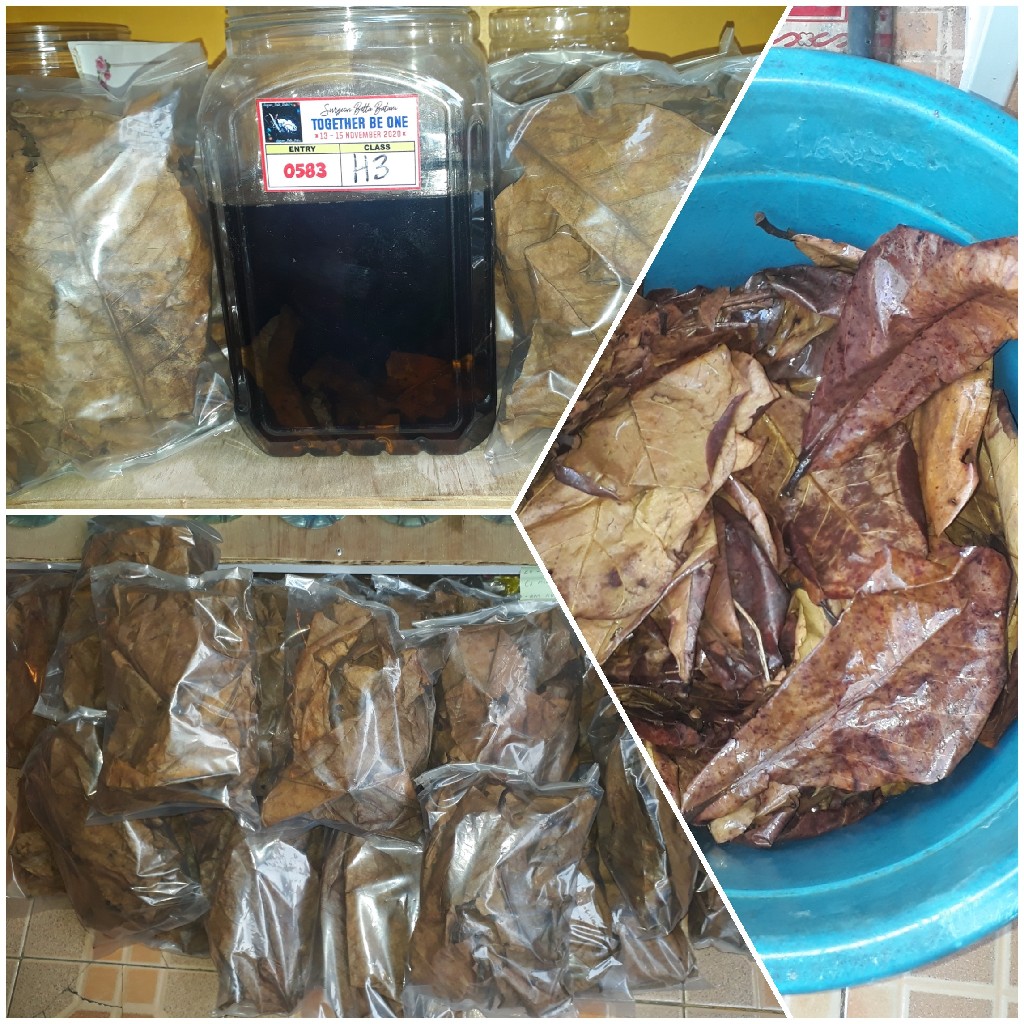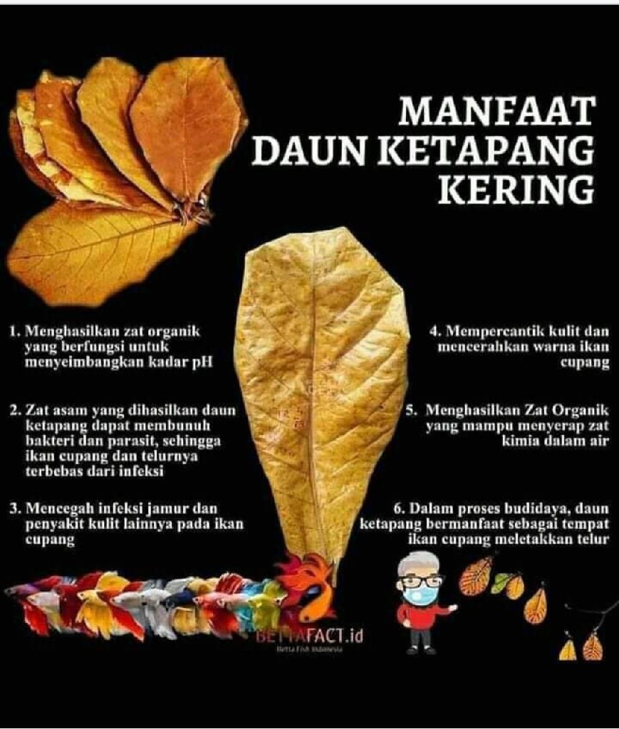 Daun ketapang olahan merupakan produk dari dau ketapang yang di olah hingga bersih dan siap di berikan pada media pemeliharaan : manfaat dau ketapang olahan : 1. Daun bersih dan steril karena diolah dengan teknik dan bahan yang baik 2. mempercepat mutasi warna pada ikan khususnya ikan cupang 3. menghasilkan zat organik yang dapat menyeimbangkan pH Harga 5000/ pcs grosir 4000/pcs