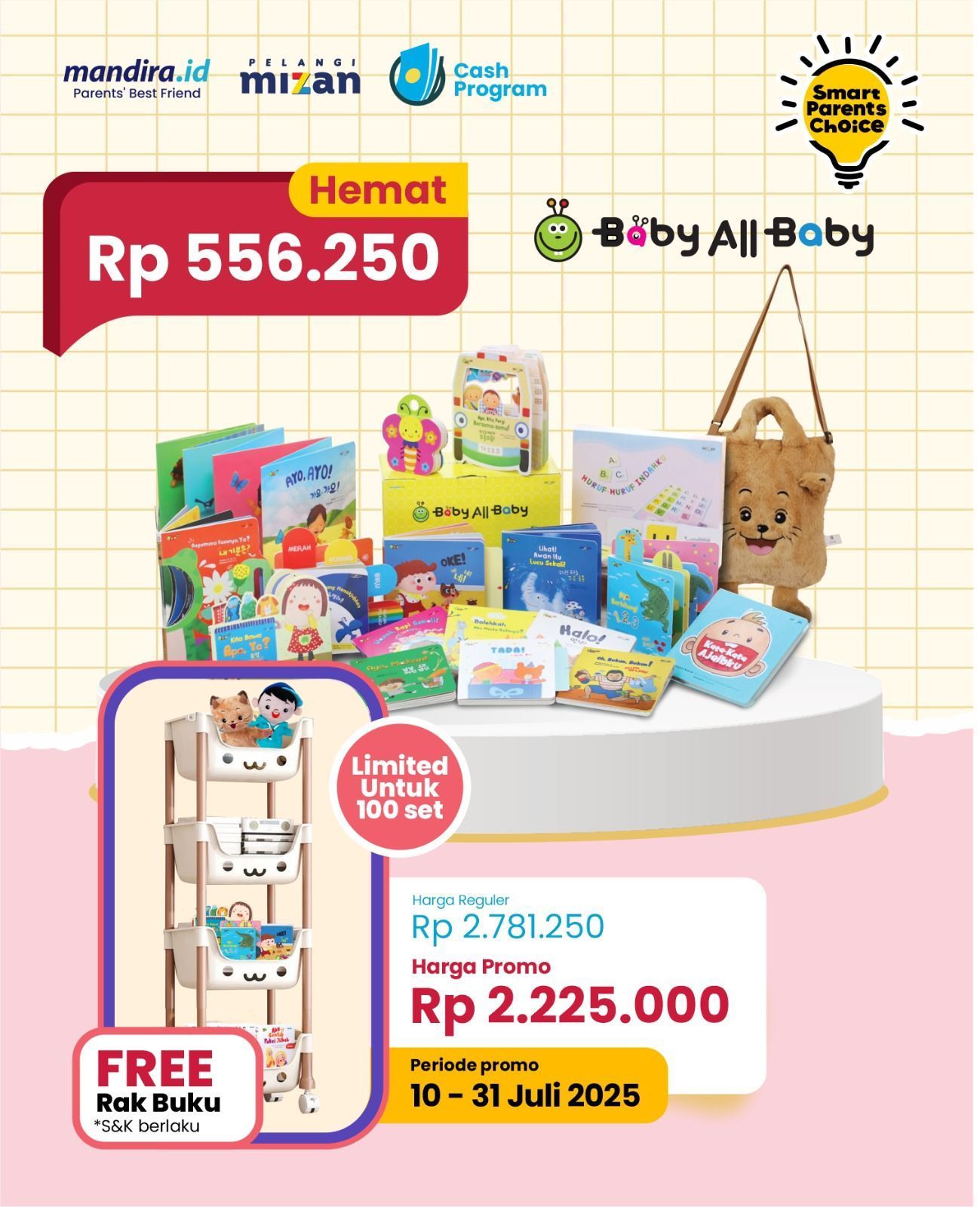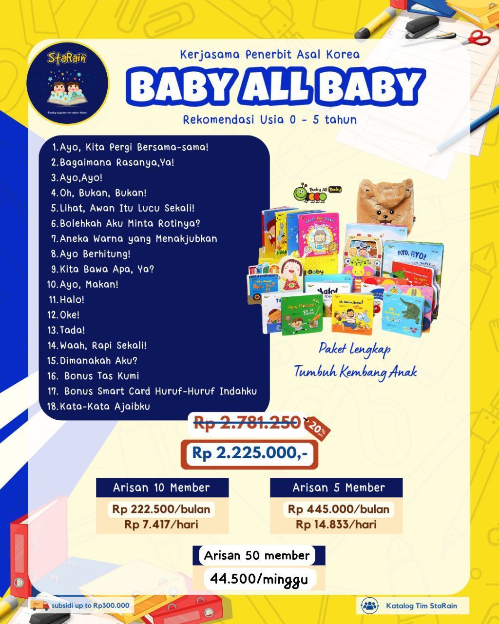 Hi dear Mommss ???????????? ada Buku Baby All Baby nichhh.. lagi ada bonus rak Cuantik lho (limited ????????).. "Baby All Baby" adalah produk buku paket yang ditujukan untuk menstimulasi tumbuh kembang anak usia dini, dengan fokus pada ragam kecerdasan majemuk (IQ, EQ, SQ, EI, dan LQ). Buku ini merupakan terjemahan dari penerbit besar di Korea dan dikemas secara interaktif dengan ilustrasi yang menarik dan aman untuk anak-anak.. grab it Fast my dear parents ????????
