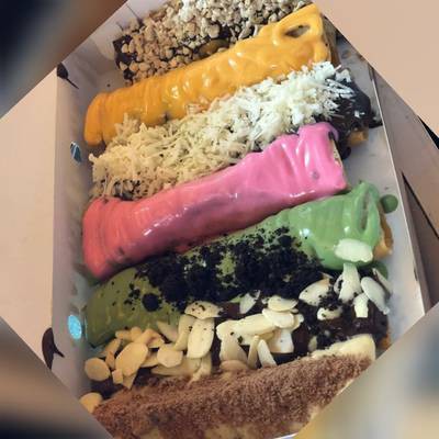 Varian isian : 1. Pisang + cokelat 2. Pisang + keju Varian toping : 1. Keju 2. Cokelat 3. Strawberry 4. Matcha 5. Original/Tanpa toping Note : 1. Po minimal 1 hari 2. Bisa request toping jika tersedia 3. Sistem Cod dan Delivery 5. Satu kotak isi 5 pcs 6. Bisa mix toping Ketentuan Delivery : 1. Minimal order 4 kotak 2. Khusus daerah indralaya 3. Tidak melayani delivery diluar daerah Indralaya